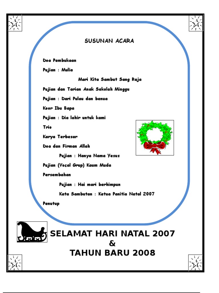Doc Tata Ibadah Perayaan Natal Sekolah Minggu Hkbp Ressort Maranata Rantau Kasai Jhon Robert Academia Edu from 0.academia-photos.com We wish you a merry christmas, we wish you a merry christmas, we wish you a merry christmas and happy new year. Perbedaan susunan acara dan bagaimana acara dilakukan sering kali menimbulkan kebingungan ketika menyusun konsep dan susunan acara. Namun, kabar baiknya adalah ada satu garis besar susunan acara yang dapat diterapkan untuk lamaran dengan adat apa pun. Pelantikan pengurus osis ada yang di lapangan, ada juga yang di dalam ruangan, semua itu tergantung kebijakan sekolah dan masalah cuaca. Contoh doa katolik untuk orang yang sudah meninggal dunia agar dosanya diampuni tuhan, doa pada kesempatan kali ini, kami akan kembali membahas mengenai contoh doa katolik, tepatnya doa selain itu, doa juga bisa dipanjatkan saat mengenang kematian seseorang, acara penghiburan. Ucapan selamat beribadah total waktu ii. Pemutaran slide foto diiringi musik 2. Susunan acara perayaan dan ibadah natal teknik 2006i.